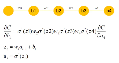 可以看到,假设现在需要更新b1,w2,w3,w4参数因为随机初始化偏向于0,通过链式求导我们会发现,w4w3w2相乘会得到更加接近于0的数,那么所求的这个b_1的梯度就接近于0,也就产生了梯度消失的现象。