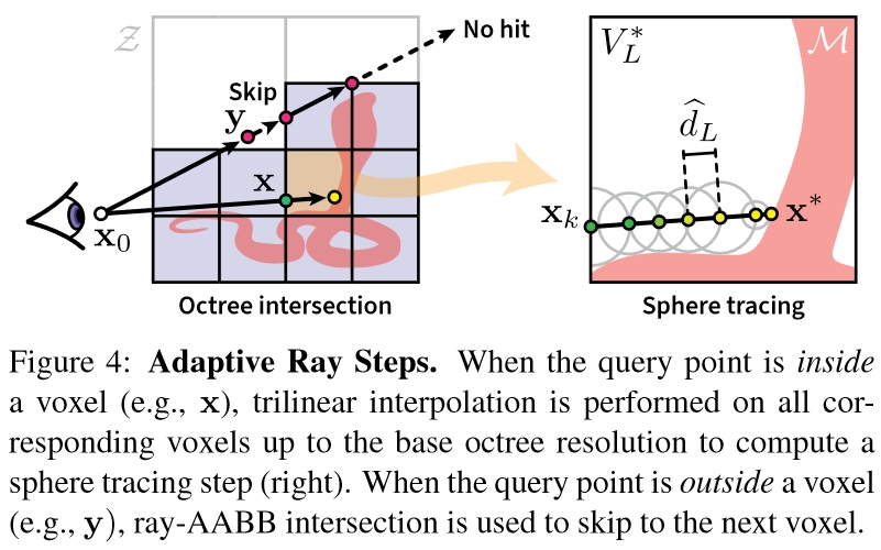 在生成的一系列光线i∈R上,会经过同一位置不同LoD层级l的多个体素,这些体素中只有一部分体素存在内容,空体素在渲染时需要跳过。本文采用的方法是将SDF里找表面的Sphere Tracing方法和判定体素相交的ray-AABB intersection方法结合起来。