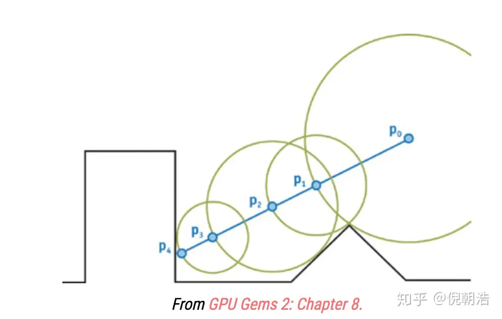 Sphere tracing是结合SDF(signed distance field)来做ray marching的技术。我们都知道,做ray marching的时候需要在给定的方向上做search,常用的方法包括linear search(每次使用增加固定的步长)以及binary search(对距离进行二分)等。(其实这个search的过程与求解最优化问题中的search是一样的)。由于方向是固定的,每次迭代使用的步长是做ray marching时需要考虑的,而SDF就完美提供了这种信息!